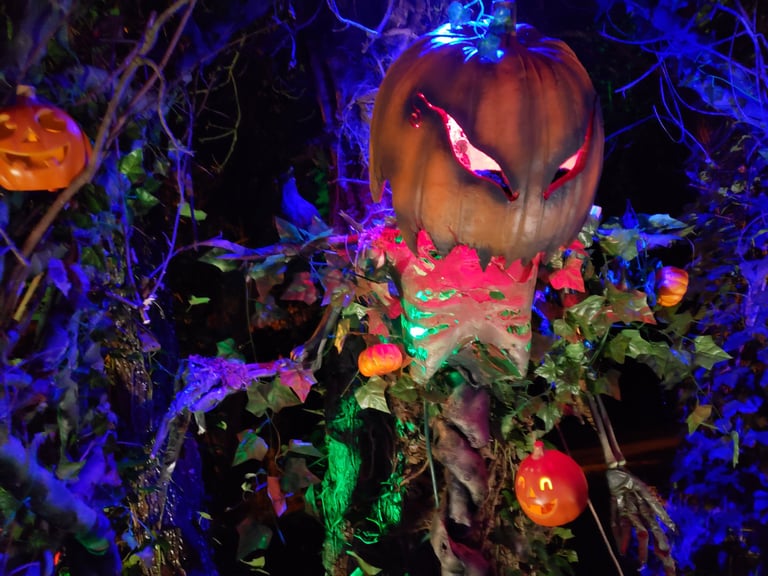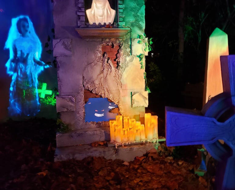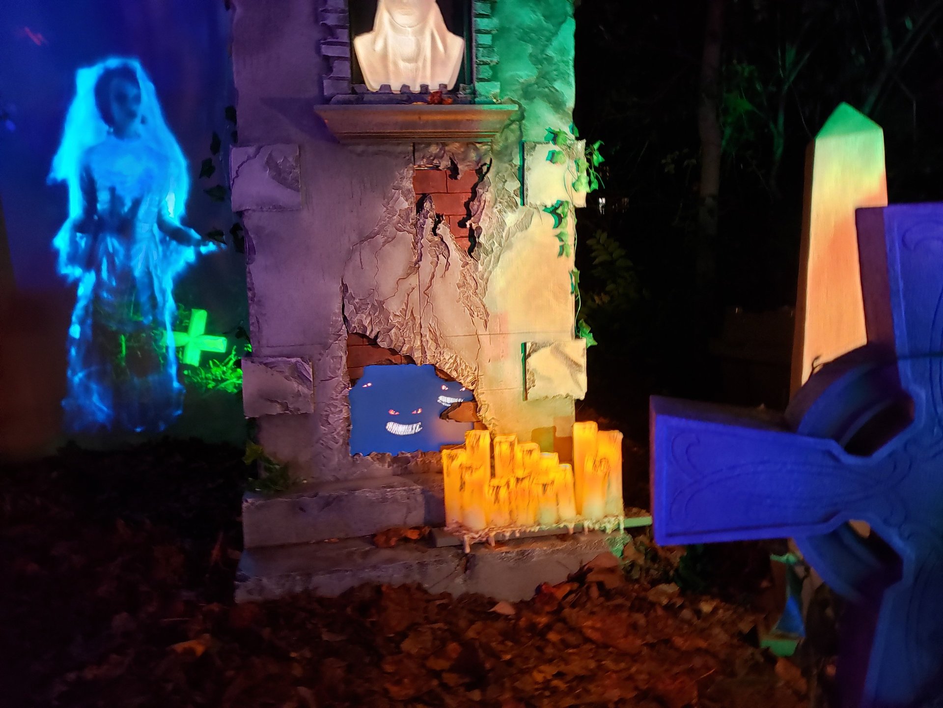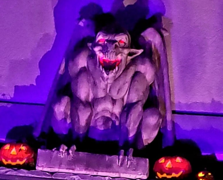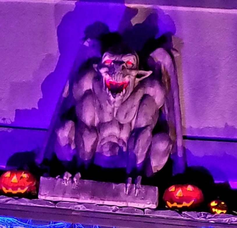 A relatively small year with little in the way of newly constructed props, Halloween 2021 did introduce multiple grotesques to the haunt; One mounted over the entryway, two flanking the door, and a few other scattered about.